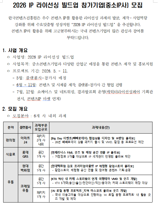 [안내](한국콘텐츠진흥원) 2026년 IP 라이선싱 빌드업 참가기업 모집 공고
